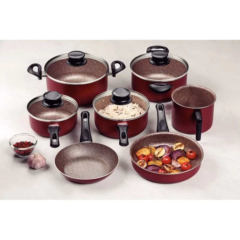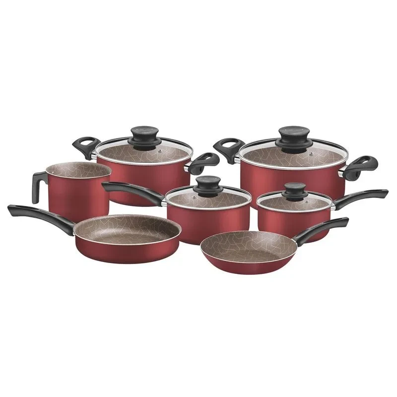 Cuerpo de aluminio con espesor que brinda una cocción rápida y uniforme.Revestimiento interno y externo de antiadherente Starflon Max, que no deja que se peguen los alimentos y es fácil de limpiar, más durable y no perjudicial para la salud, ya que está libre de PFOA.Tapas de vidrio templado, con salida de vapor y bordes de acero inoxidable. Mangos, asas de baquelita antitérmica y agarradores de nylon que proporcionan seguridad durante la manipulación.Utensilio de nylon que puede utilizarse a temperaturas de hasta 180 °C y mango con orificio pasante. Pueden ir al lavavajillas para facilitar su rutina diaria.Se la puede usar en cocinas a gas, eléctricas y vitrocerámicas ? resistencia eléctrica. ¡La batería de cocina Tramontina Paris en aluminio con revestimiento interno y externo antiadherente Starflon Max rojo de 7 piezas posee elementos especiales para realizar sus tareas en la cocina! Posee piezas fabricadas en aluminio con revestimiento interno y externo antiadherente Starflon Max, atributos que proporcionan una cocción uniforme de los alimentos y evita que se peguen en la superficie. Sus ollas y la cacerola poseen tapas de vidrio templado con bordes de acero inoxidable, sus mangos y asas son de baquelita antitérmica y sus agarradores son de nylon, materiales que ofrecen un manejo seguro y cómodo, ya que no se calientan. Además, es un juego fácil de limpiar y apto para lavavajillas. ¡Con Tramontina tiene lo mejor para equipar su cocina!